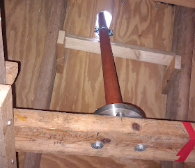 Onder het dak heb ik een stuk 5/4" draadbuis vastgemaakt; de onderkant op een flens die op een horizontaal balkje staat, en de bovenkand met een beugel aan een stukje nieuwe gording. Bovenaan deze buis is een wat langer stuk draad gesneden. Op deze draad zit een PVC schroefbus, die die weer in een verloop van 50 x 125 is gedraaid, die zelf weer in een 125 mm sok is gelijmd: